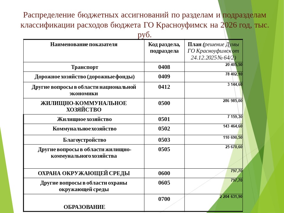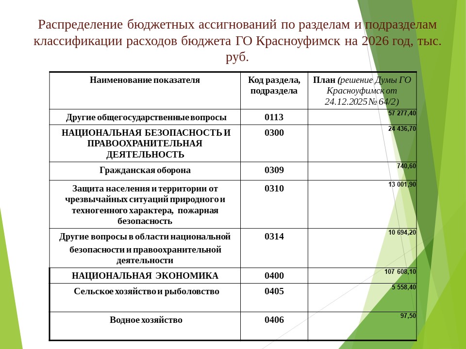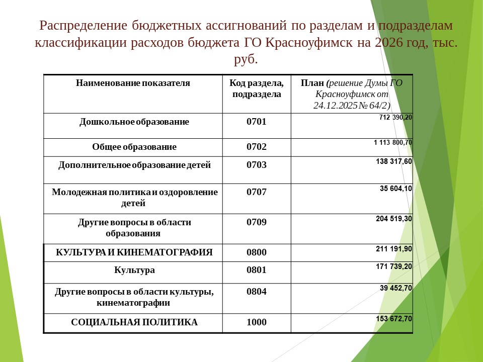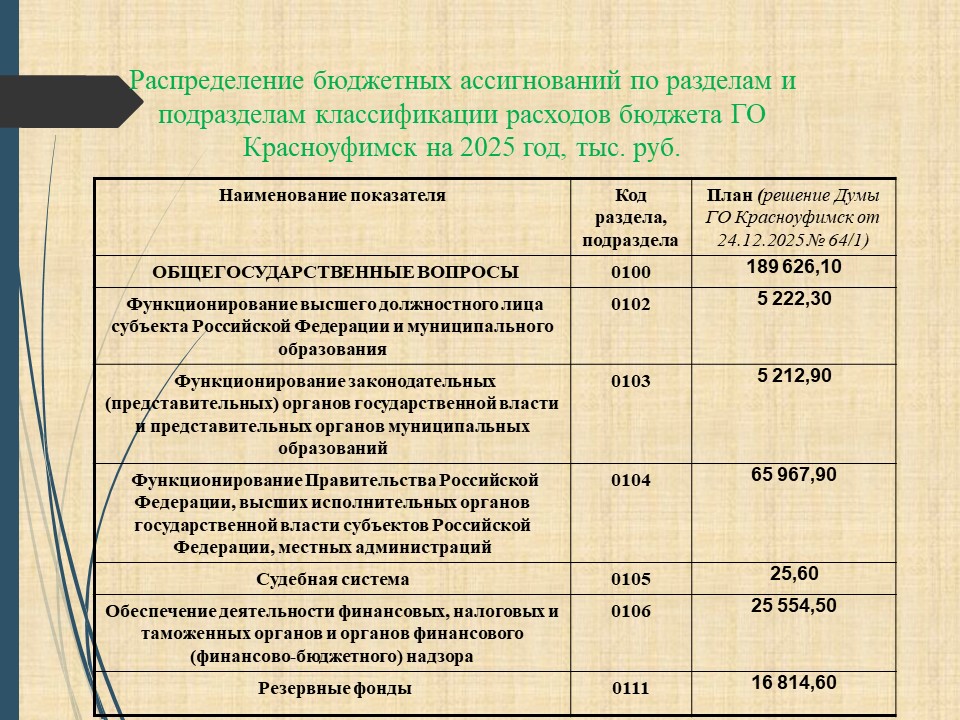Основные параметры бюджета на 2026 год, расходы по разделам и подразделам (на 01.01.2026)
