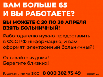 “Принято решение о временном порядке дистанционного оформления электронных больничных работающим гражданам 65 лет и старше на период самоизоляции с 20 до 30 апреля. Больничный будет выдаваться на основе данных, которые работодатели в электронном виде направляют в Фонд социального страхования. Гражданам не потребуется предоставлять какие-либо дополнительные сведения или документы”, — заявил Министр труда и социальной защиты РФ Антон Котяков.