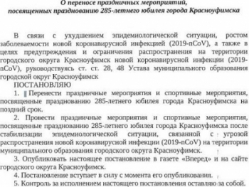 О переносе праздничных мероприятий, посвященных празднованию 285-летнего юбилея города Красноуфимск