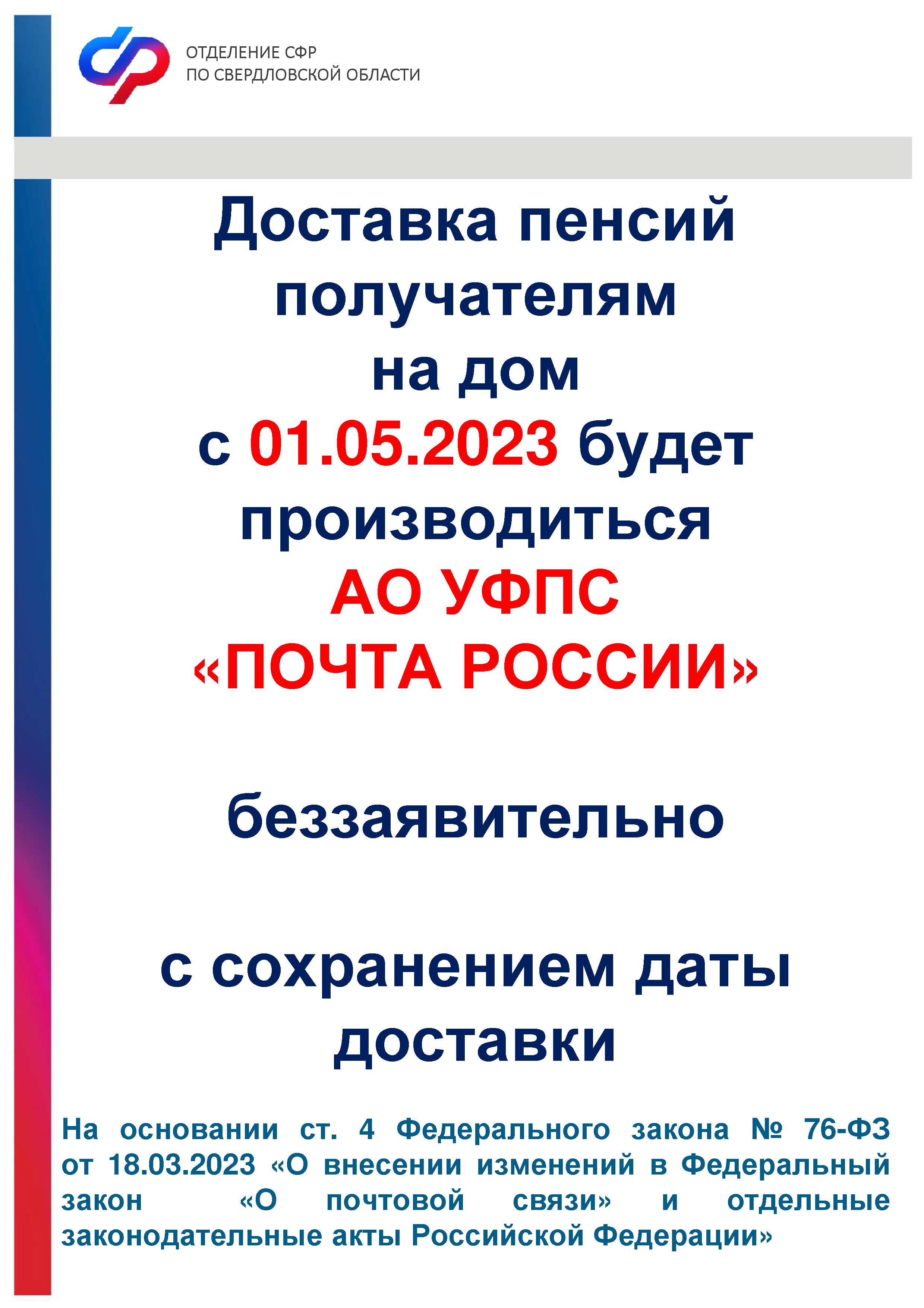Доставка пенсий получателям на дом с 01.05.2023 будет производиться АО УФПС «ПОЧТА РОССИИ»