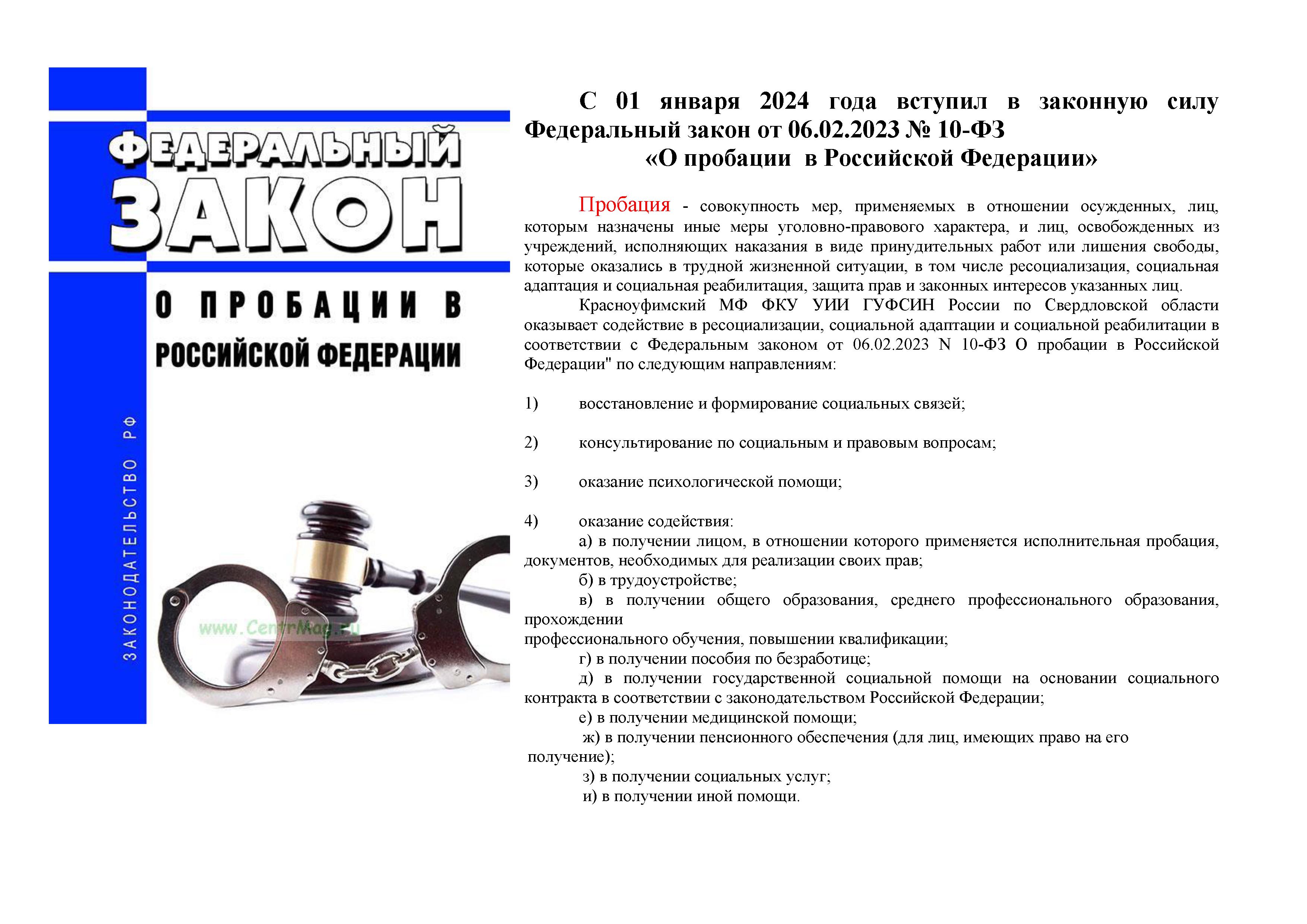 С 01 января 2024 года вступил в законную силу Федеральный закон от 06.02.2023 № 10-ФЗ «О пробации в Российской Федерации»