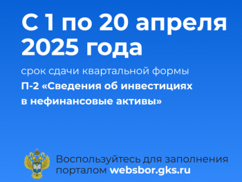 С 1 по 20 апреля 2025 года необходимо направить первичные статистические данные по квартальной форме федерального статистического наблюдения № П-2 «Сведения об инвестициях в нефинансовые активы».